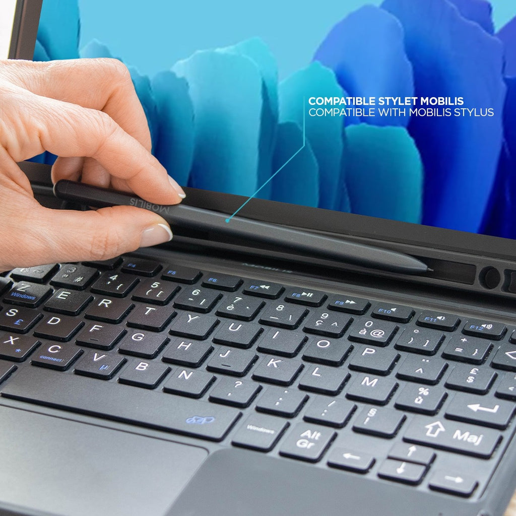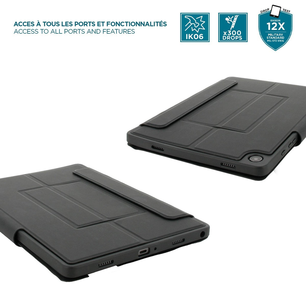 This folio case for Galaxy Tab A9+ with detachable French Bluetooth® keyboard is specially designed for the Samsung Tab A9+ 11''. It includes a slot to store the S Pen or any other stylus. Semi-rigid, this smart cover for Samsung protects the device thanks to the air pockets at the 4 corners and the structure at the bottom of the shell to absorb up to 300 drops of 90cm and disperse the shock wave. The useful tripod located behind the screen ensures the support of your tablet when using the touch screen. When transporting your tablet, the case closes thanks to a magnetic tab that protects the screen and keeps the keyboard closed. A powerful magnetic clasp allows you to use your case with or without the keyboard by simply detaching and repositioning it. The Bluetooth® keyboard is very easy to use and to connect to your device (Fn + Connect keys simultaneously to activate pairing). It offers up to 100 hours of continuous use and is charged by a USB-C/USB-A cable provided.