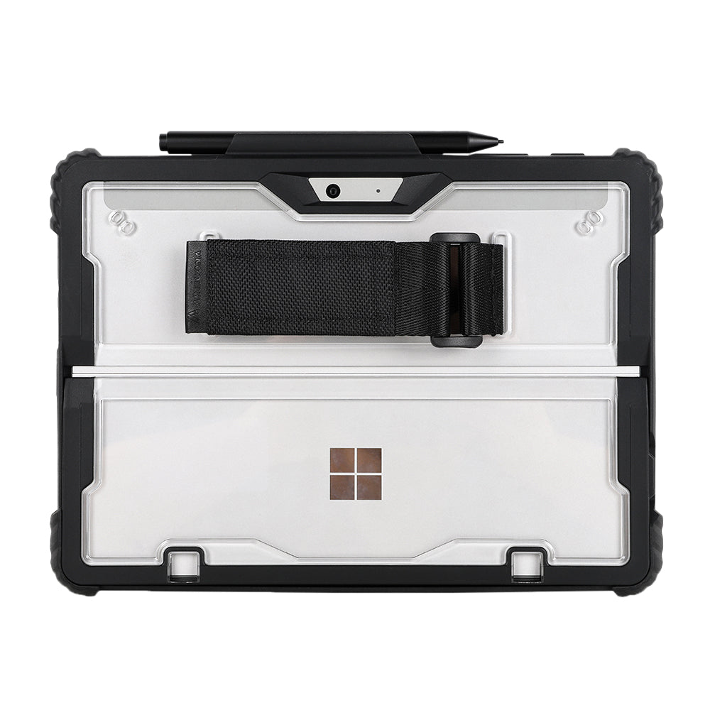 This lightweight Rugged Snap-On Case fits the Microsoft Surface Pro 8 and Surface Pro 9 tablet computer. Designed with education and business use in mind, the precision fit protective case mitigates device damage, down time and total cost of ownership. The clear polycarbonate hard shell protects against scratching while a TPU bumper provides added drop protection. An integrated easel kickstand and adjustable hand strap also aid in improving the usability of the device in rugged and mobile environments while the integrated stylus holder helps prevent losing the accessory.